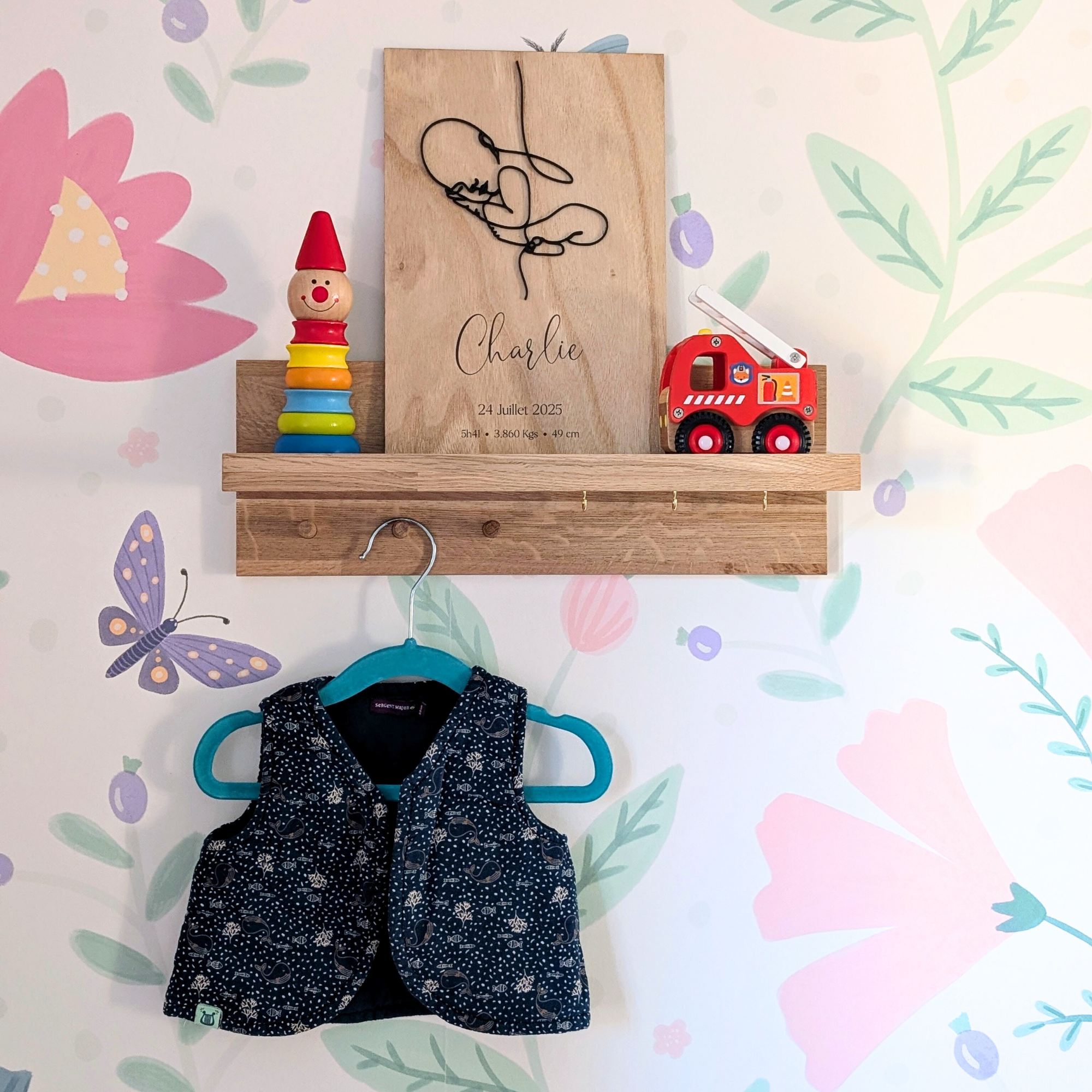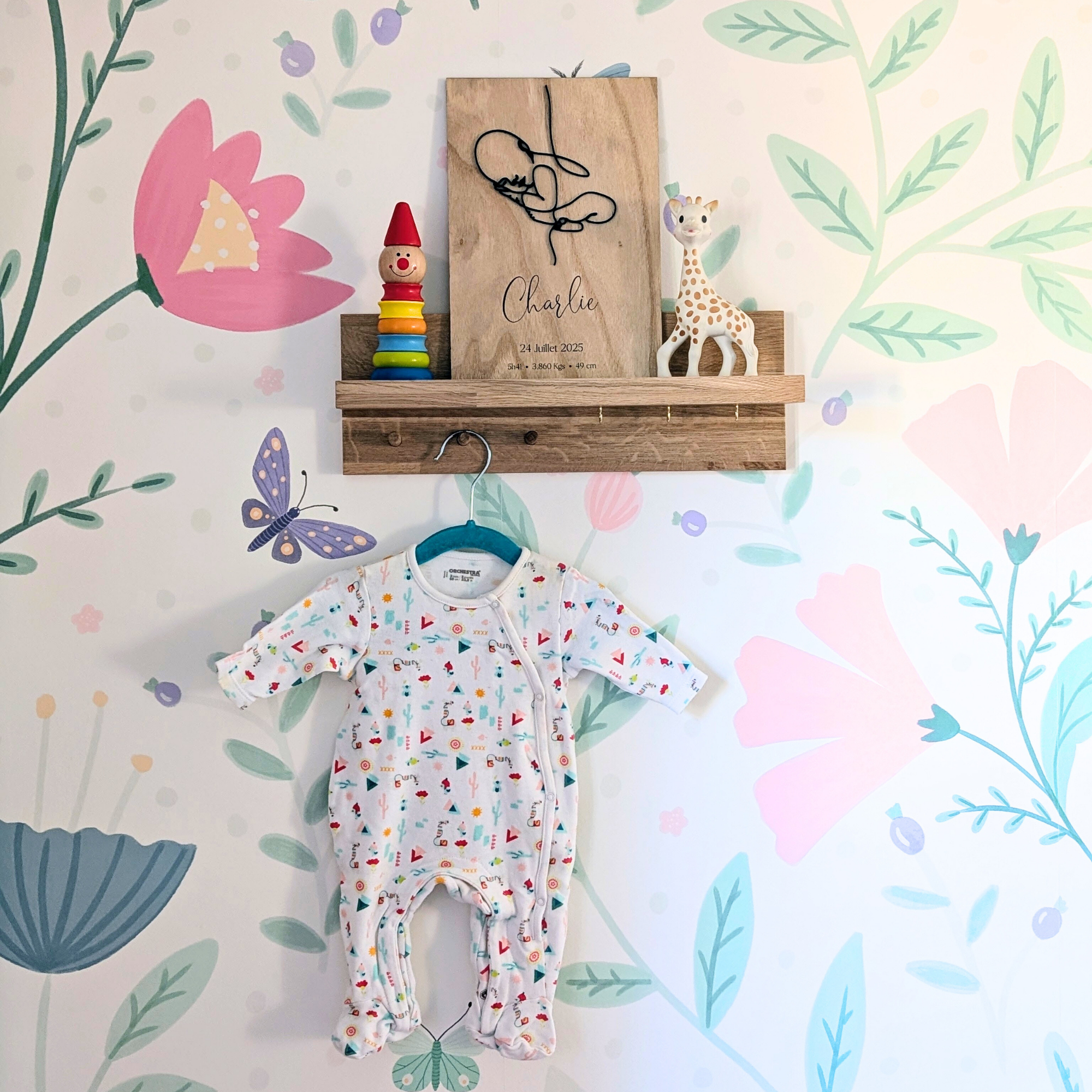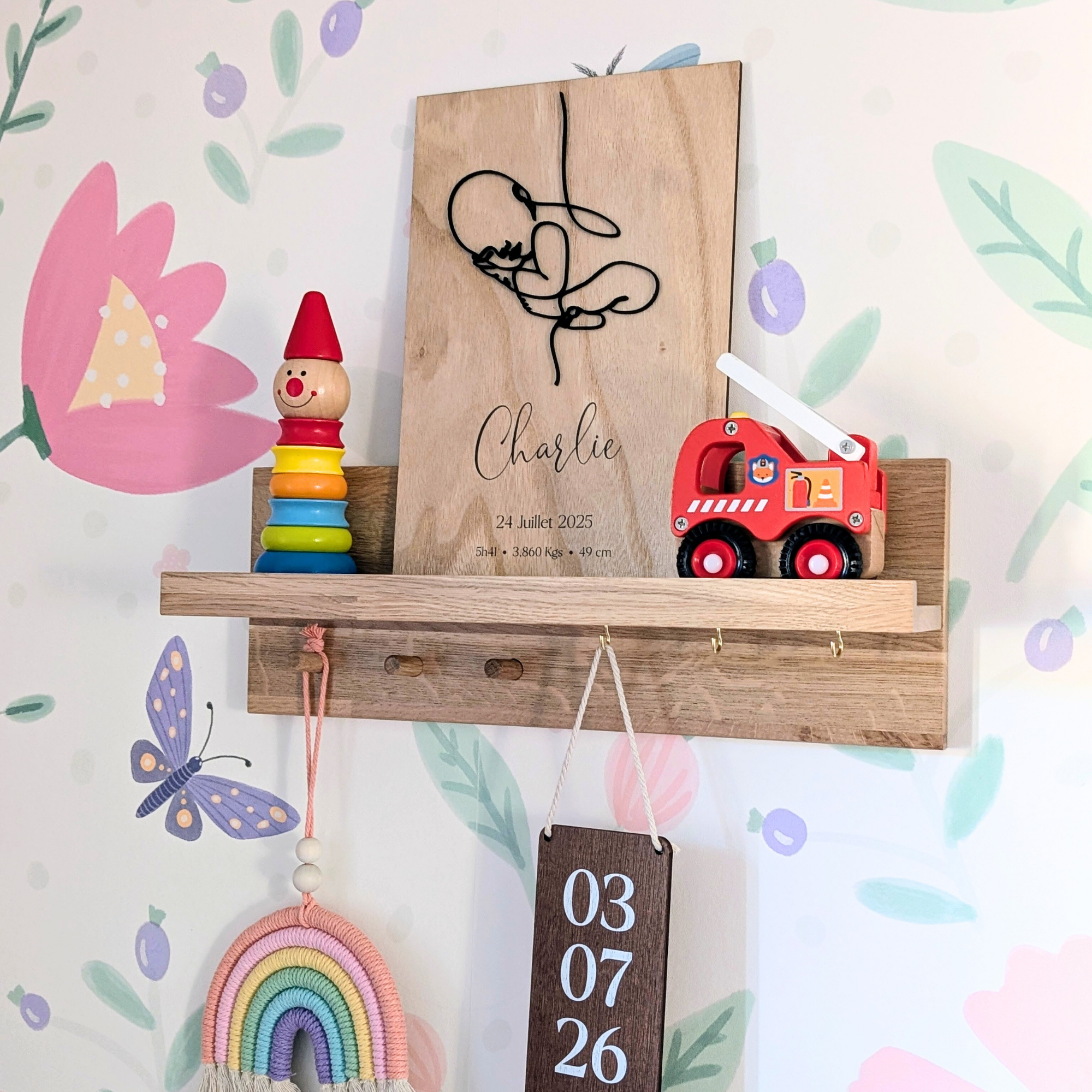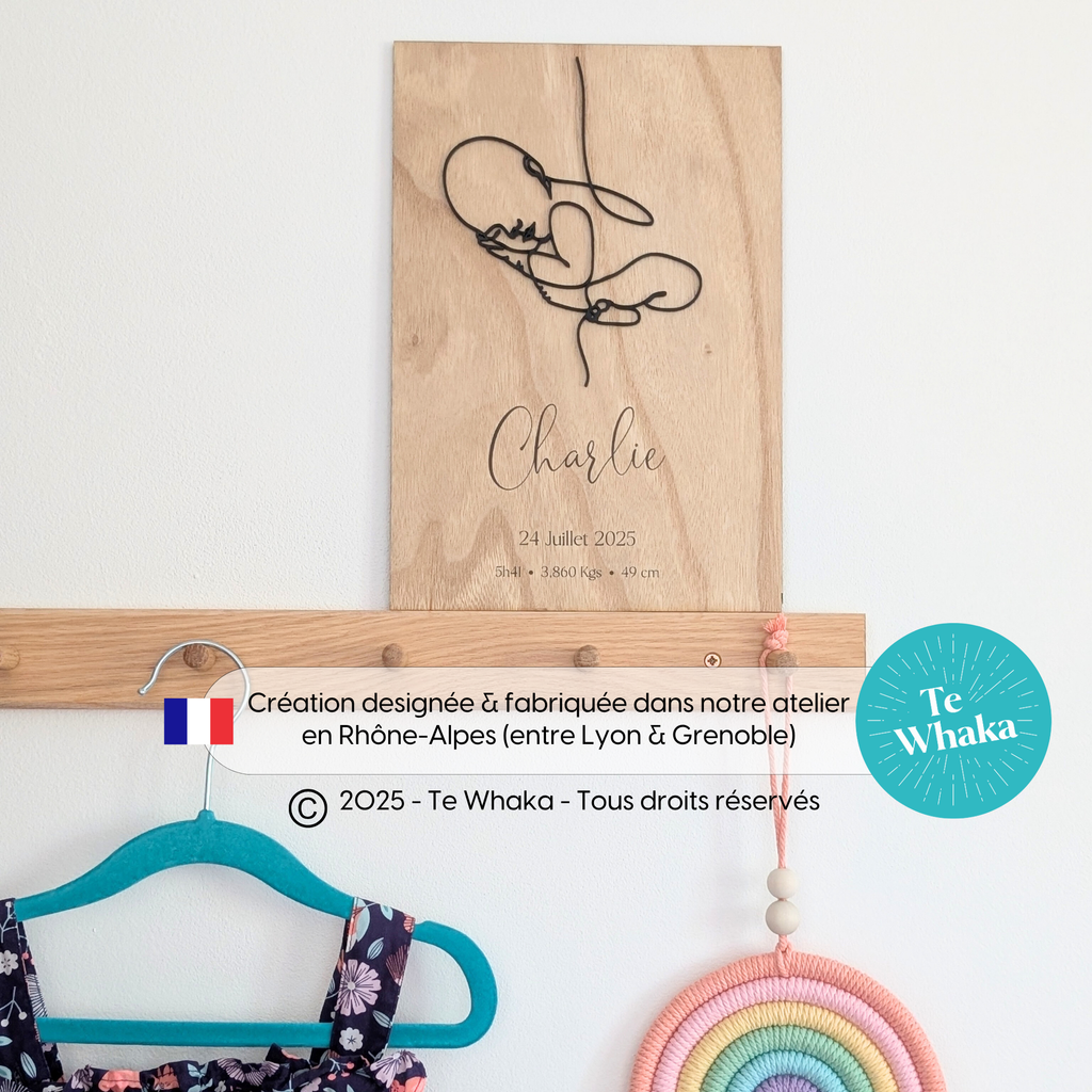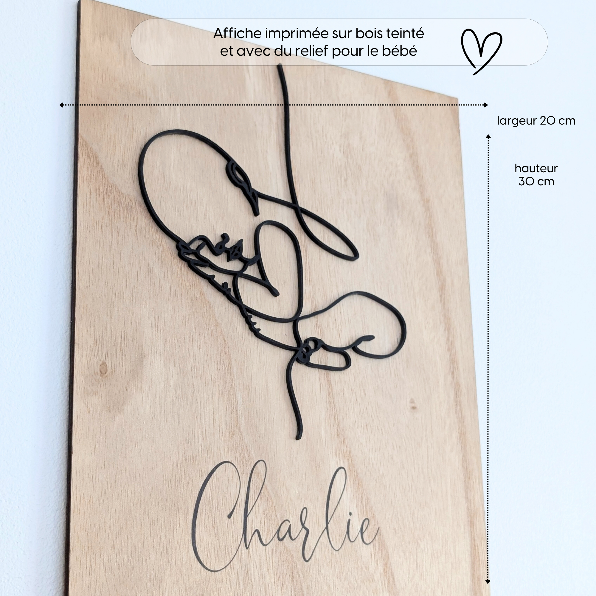 Pour la decoration de chambre de votre bébé et à garder au fil des années, découvrez et craquez sur cette affiche de naissance personnalisée, réalisée sur du bois teinté chêne, avec le dessin du bébé en relief pour donner du volume.