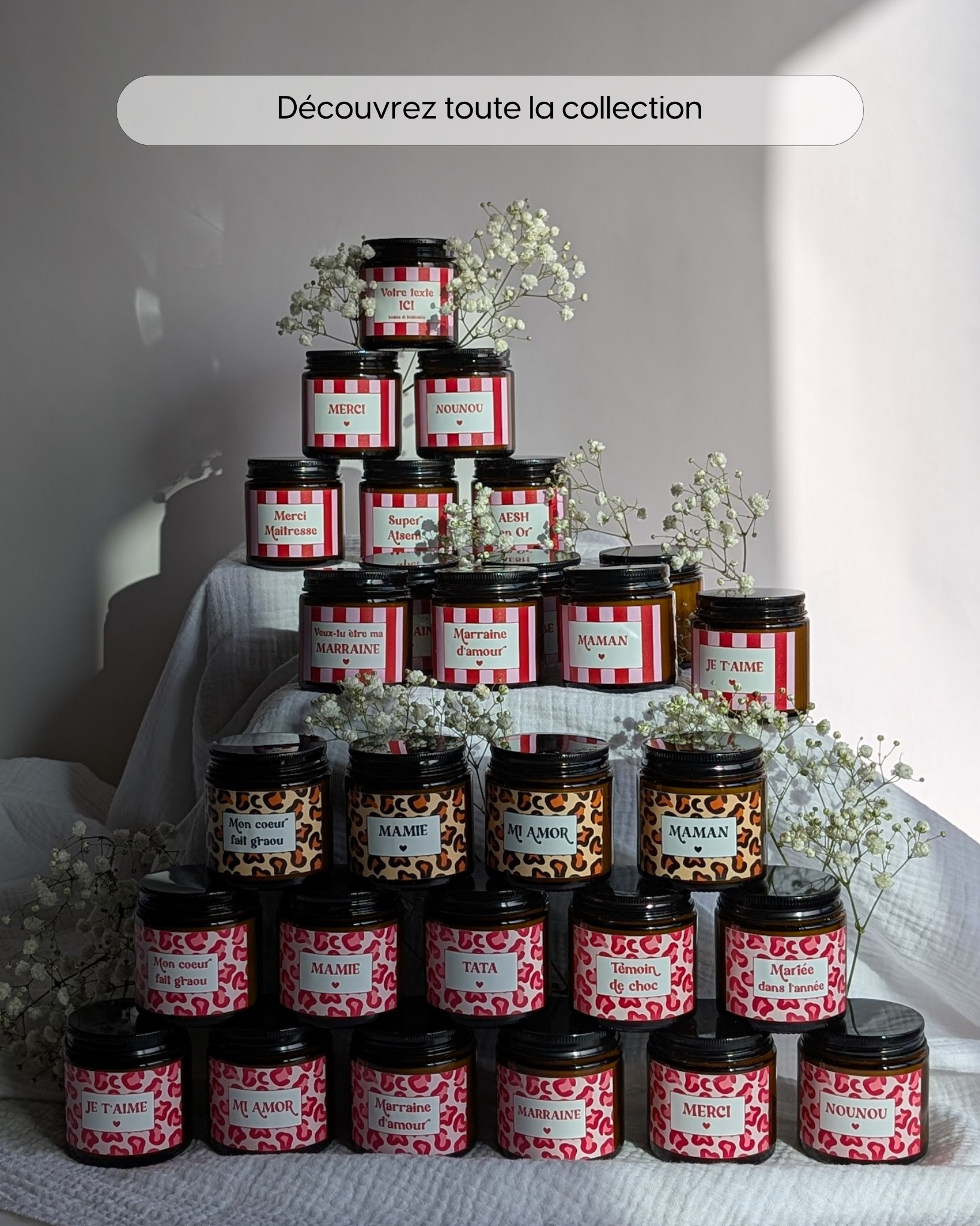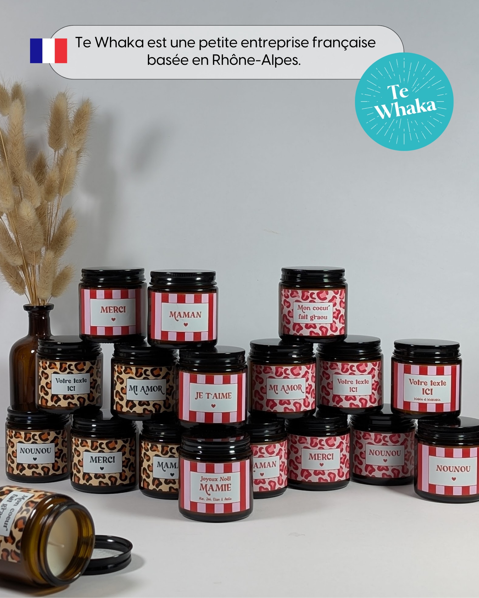 Chaque bougie est soigneusement préparée pour vous. Si nous sélectionnons des cires sans phtalates, nous personnalisons et confectionnons chaque étiquette à la main dans notre atelier, garantissant un soin particulier à votre message.