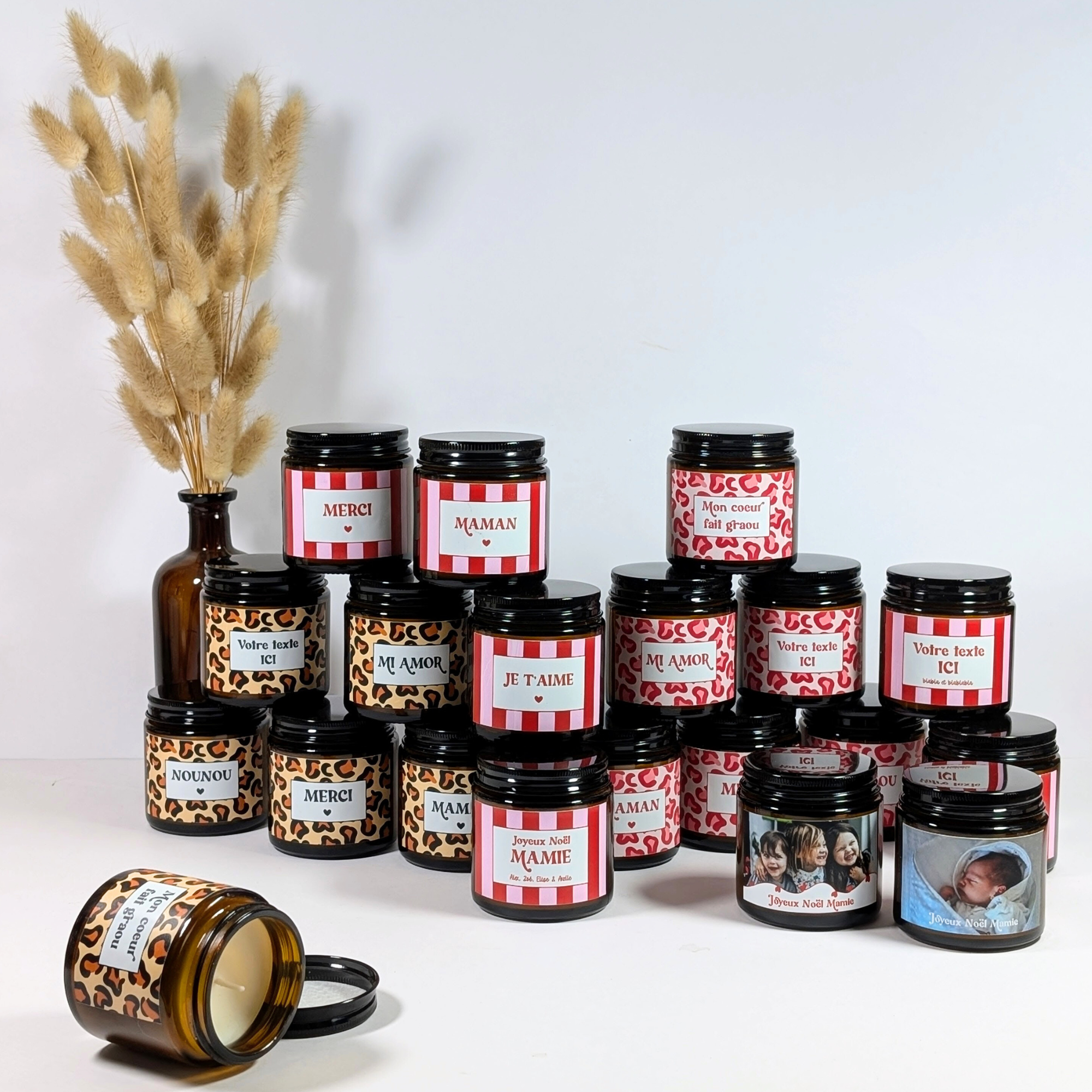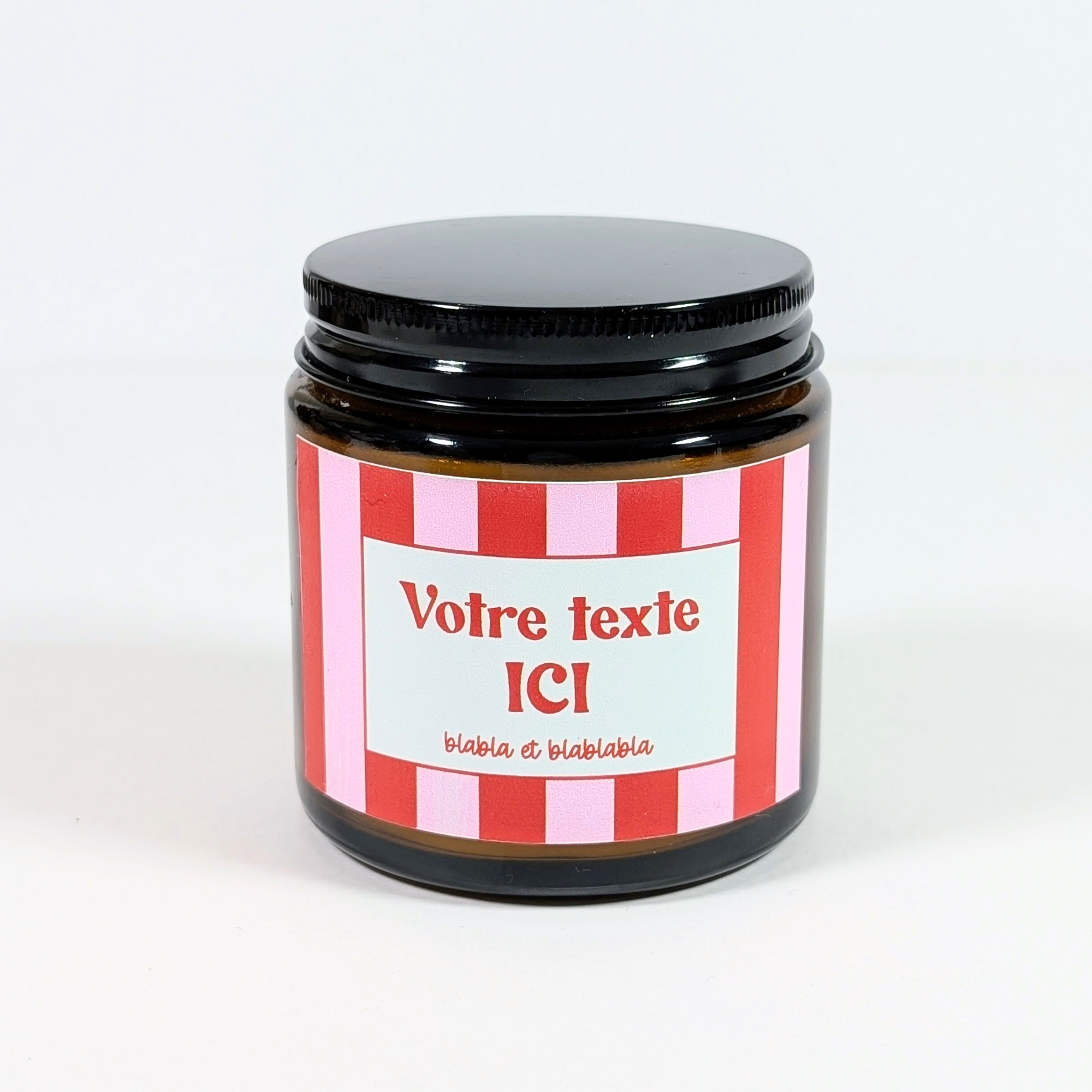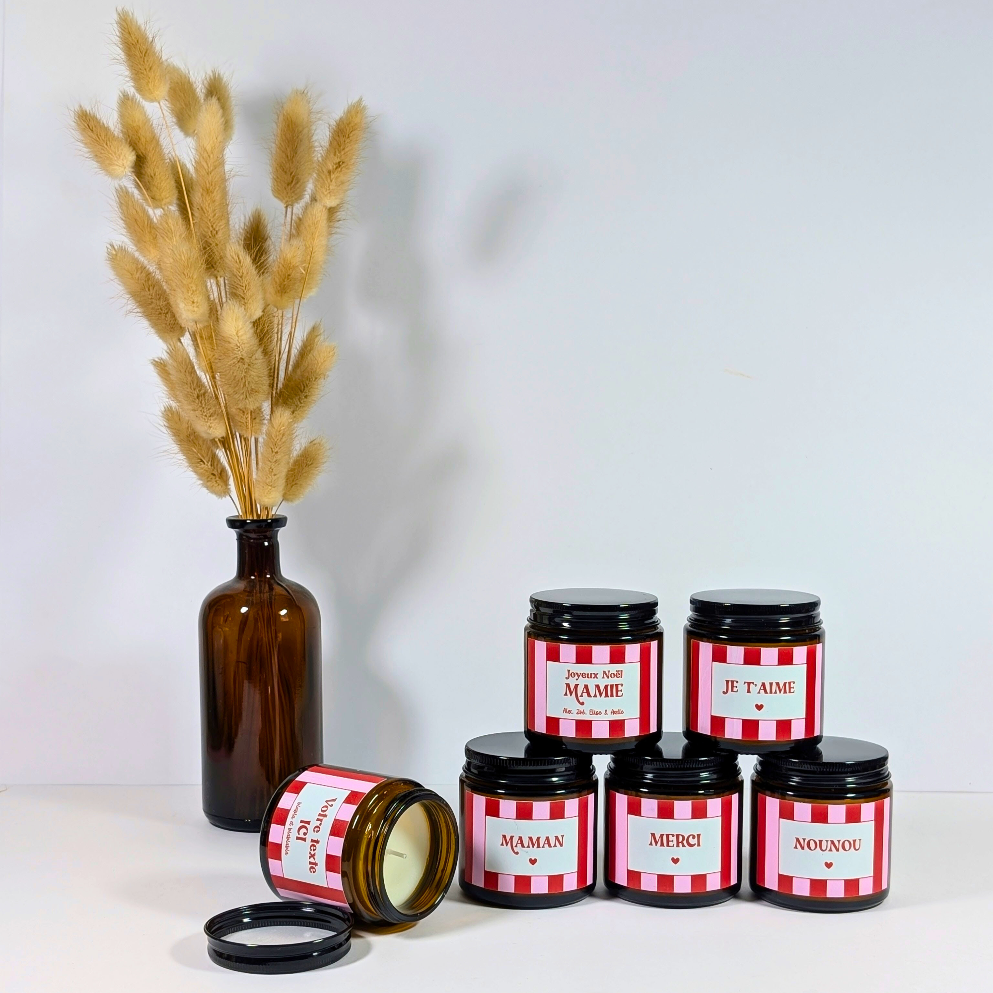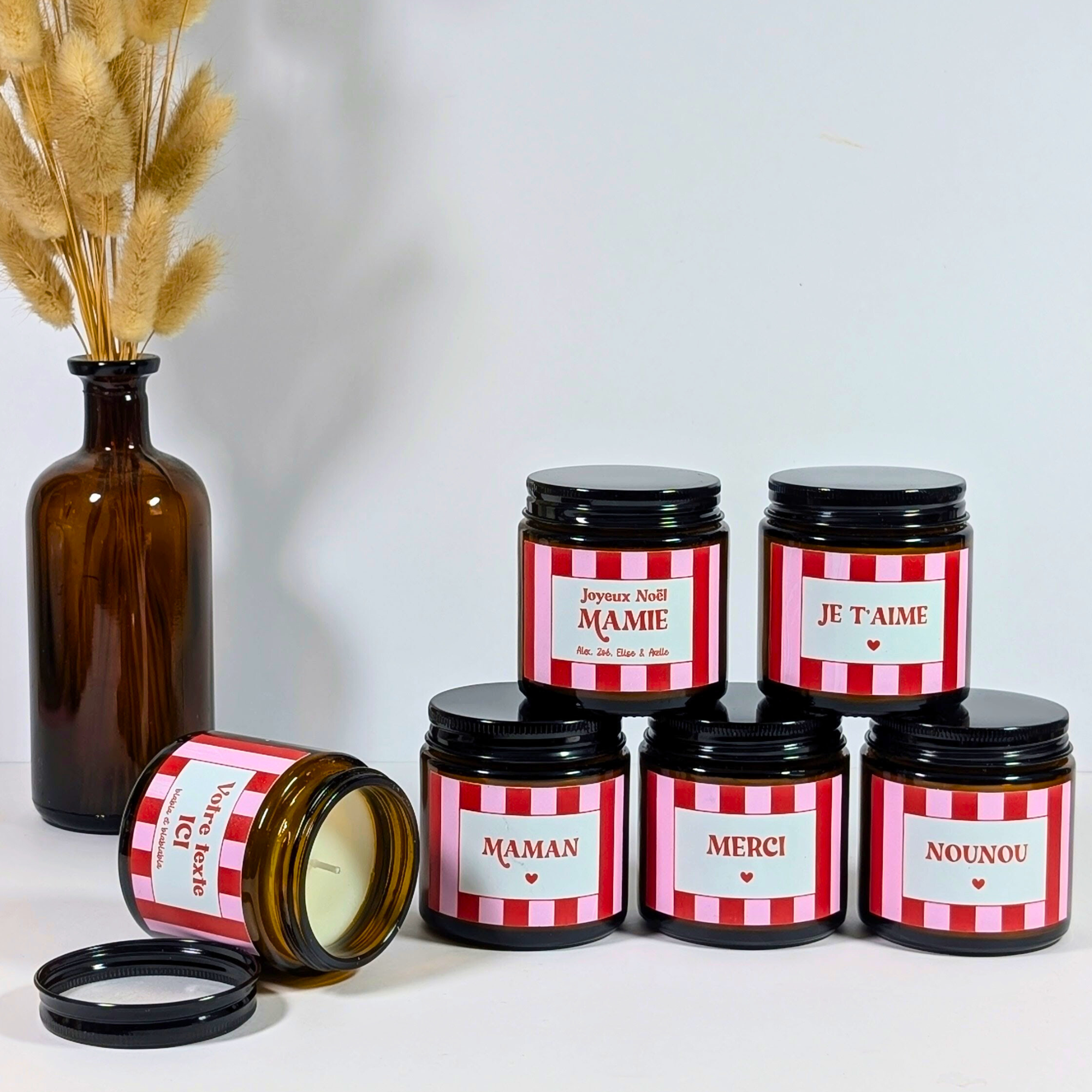 Bougie parfumée Maman, Mamie, Mi Amor, Je t'aime, Merci, Nounou | Collection bougies rayures rose-rouge