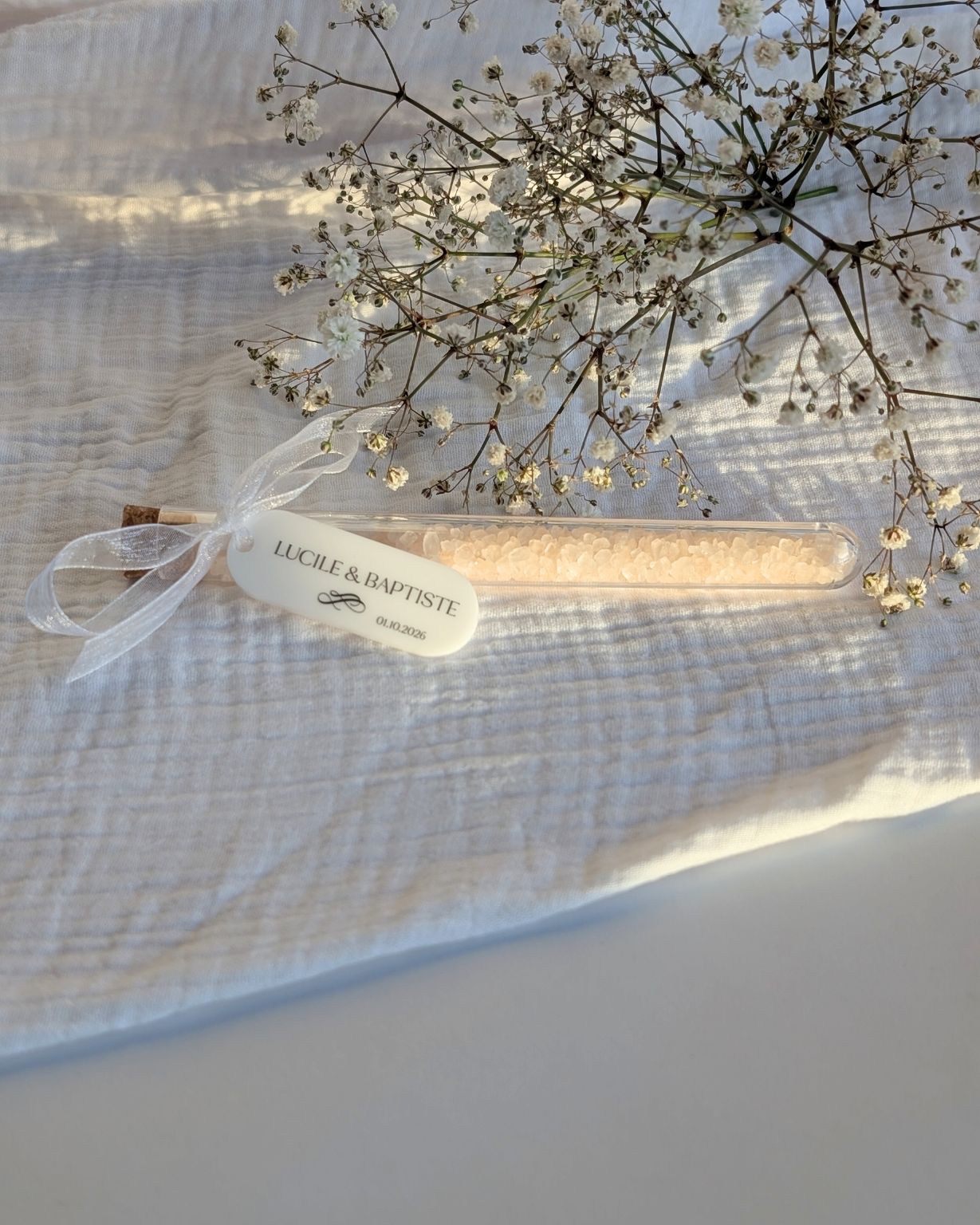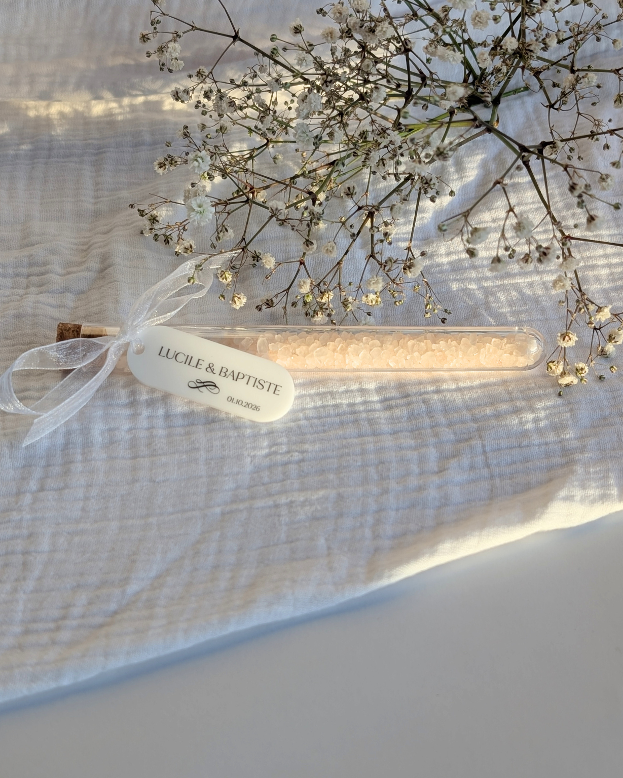 Cadeau gourmand | Fiole gourmande fleur de sel + médaillon en plexiglass mariage blanc