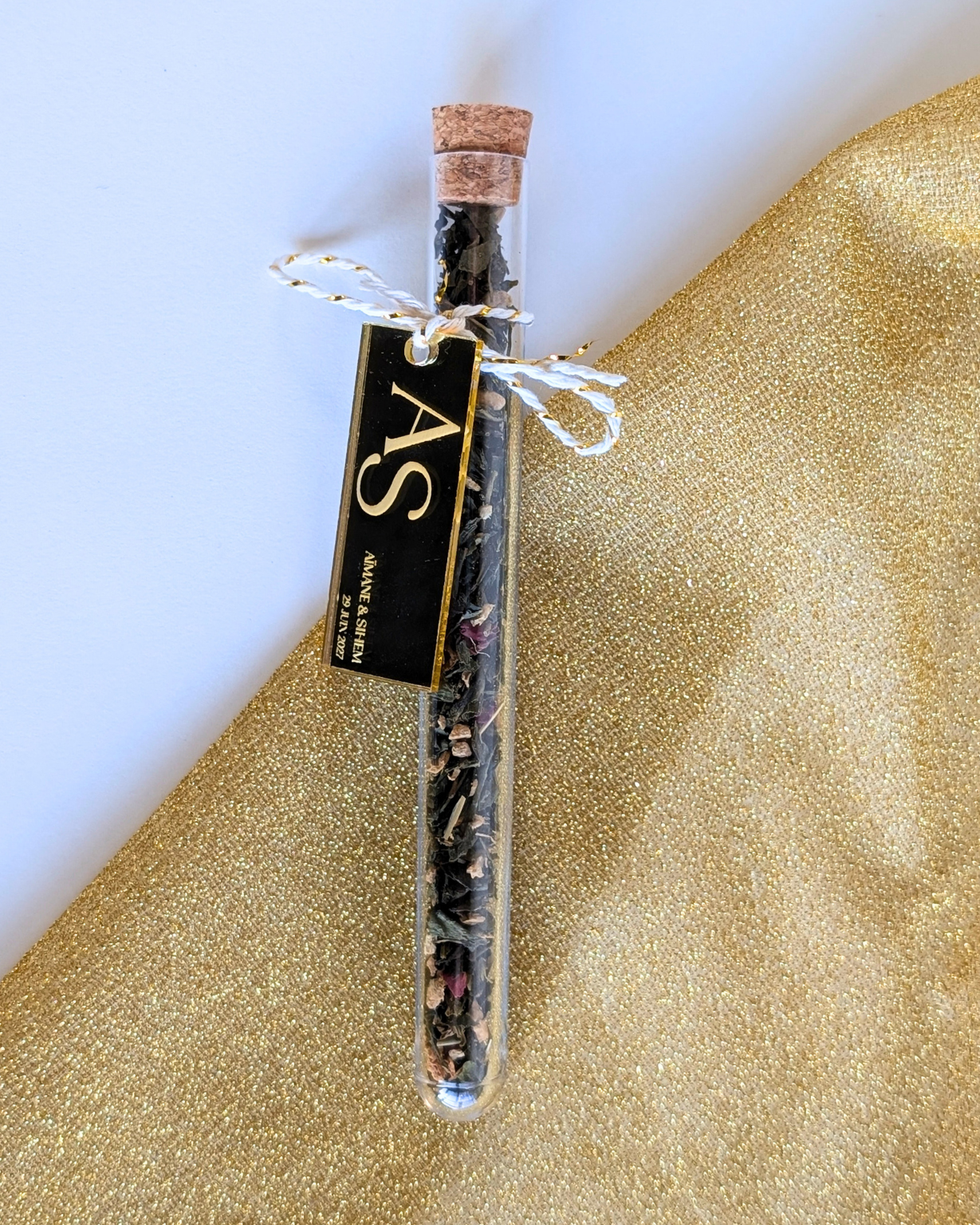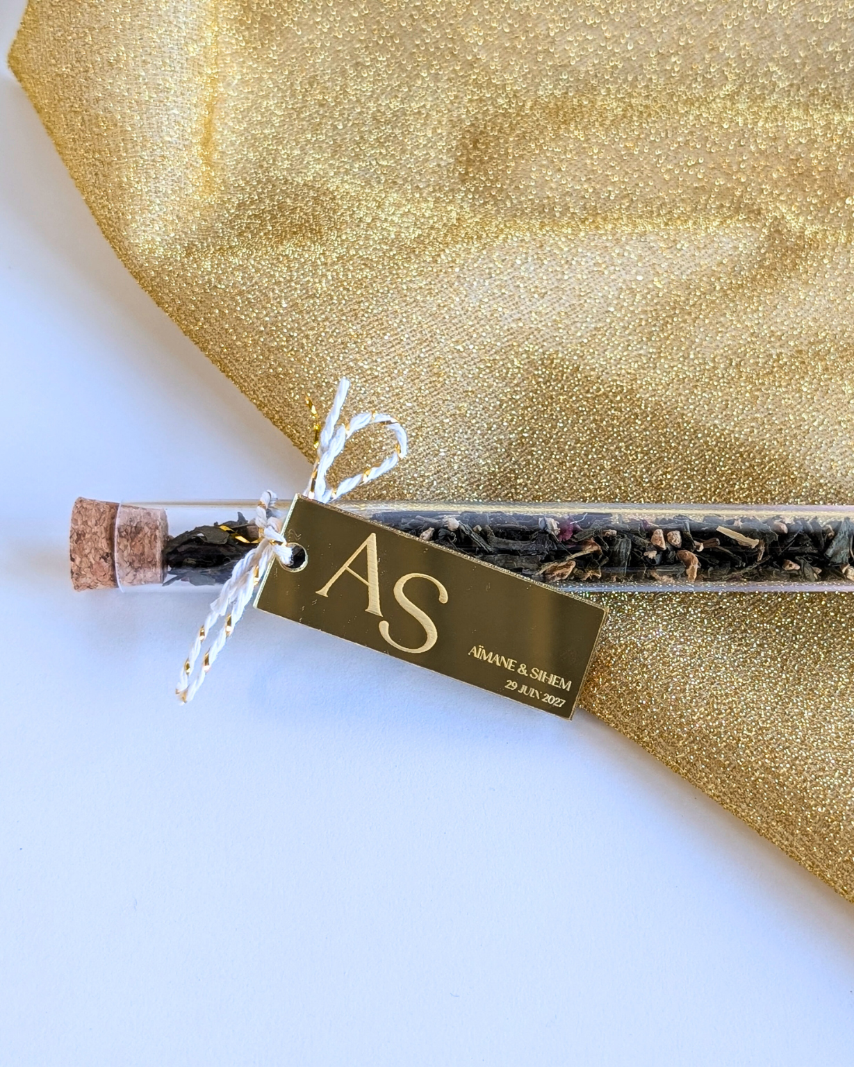 Cadeau gourmand | Fiole gourmande thé + médaillon en plexiglass mariage or