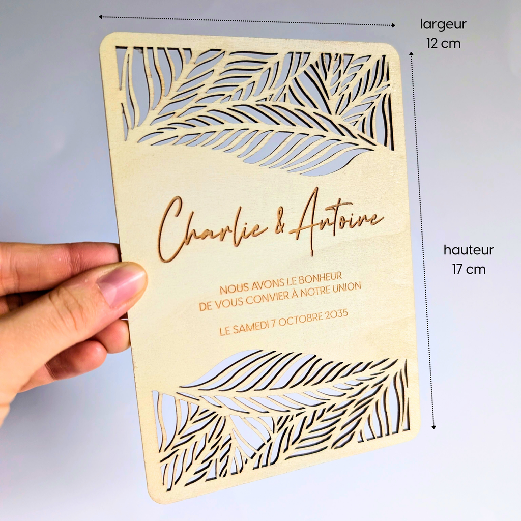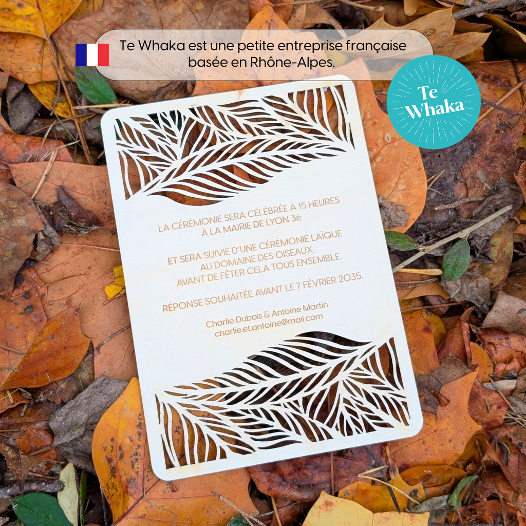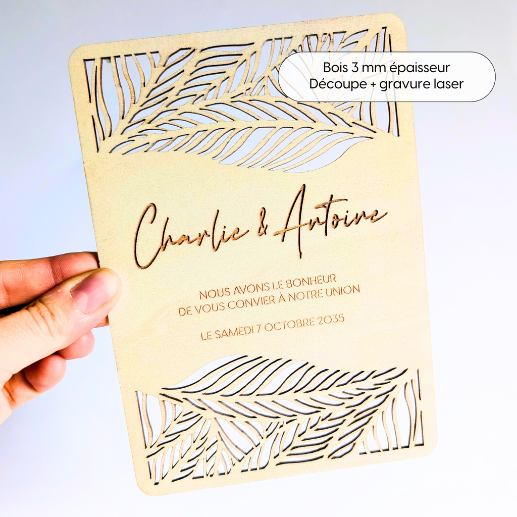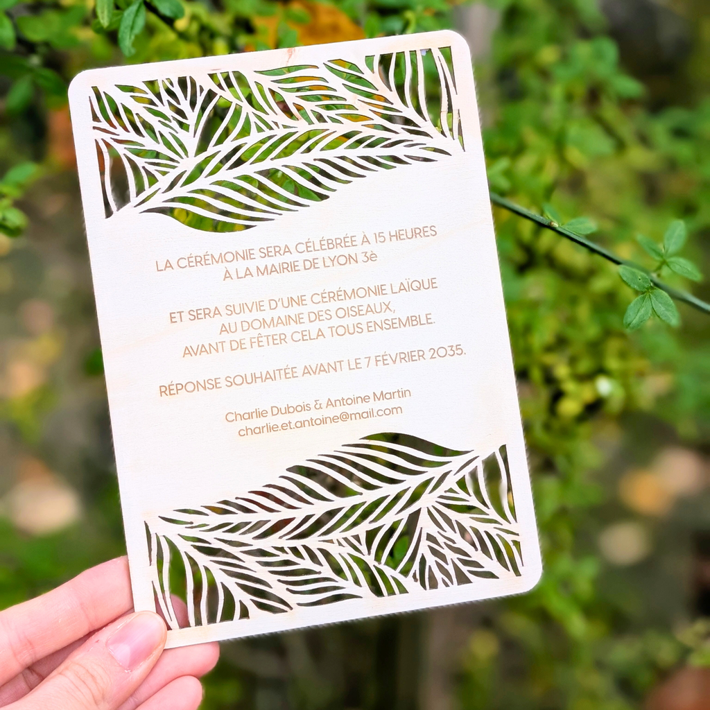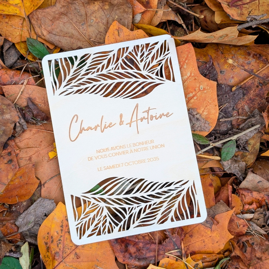 Faire part mariage bois | Faire part avec gravure et découpe laser - feuilles