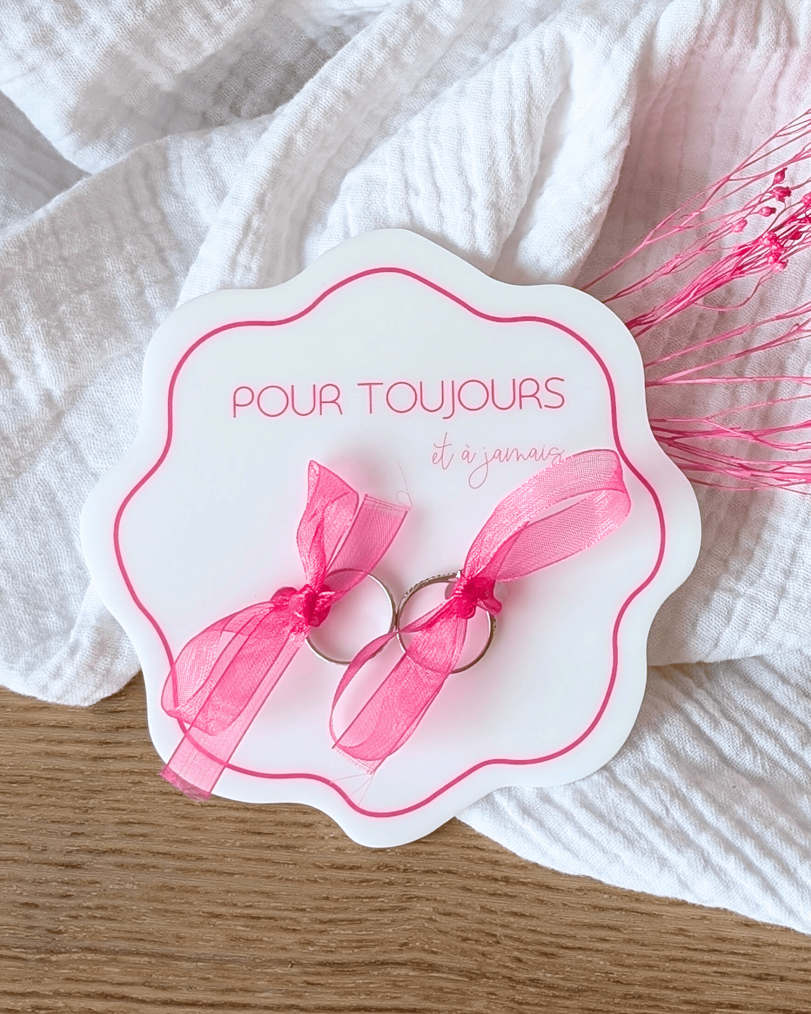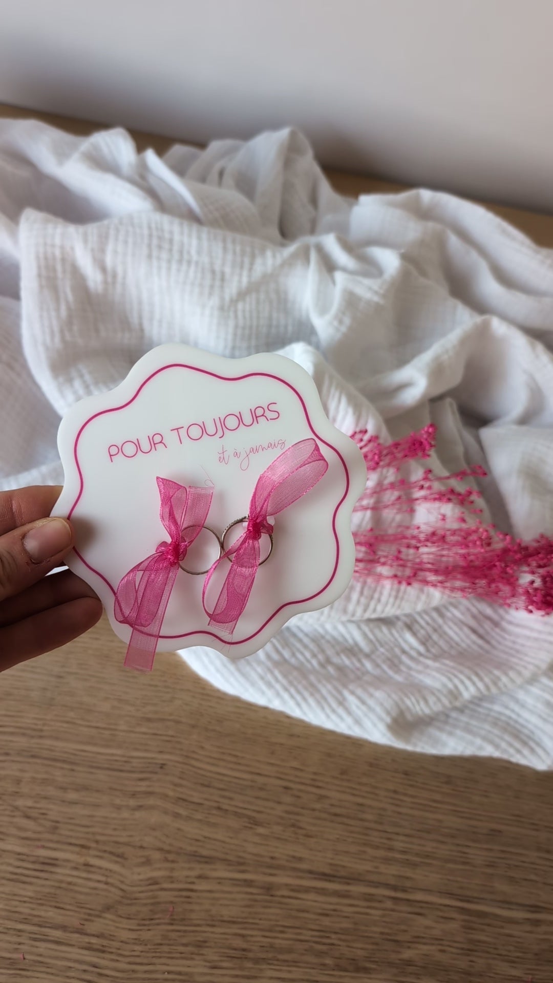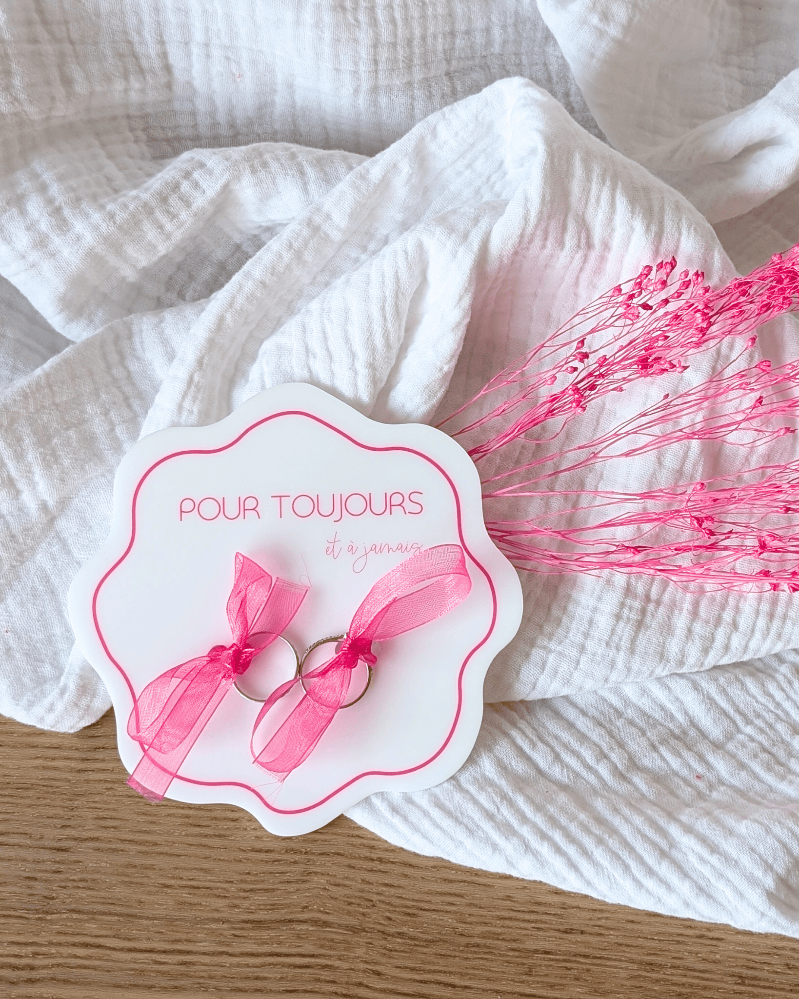 Dans la continuité et l'harmonie de la collection La vie en rose, optez pour ce porte alliance en plexiglass pour y nouer (rubans fournis) les alliances.