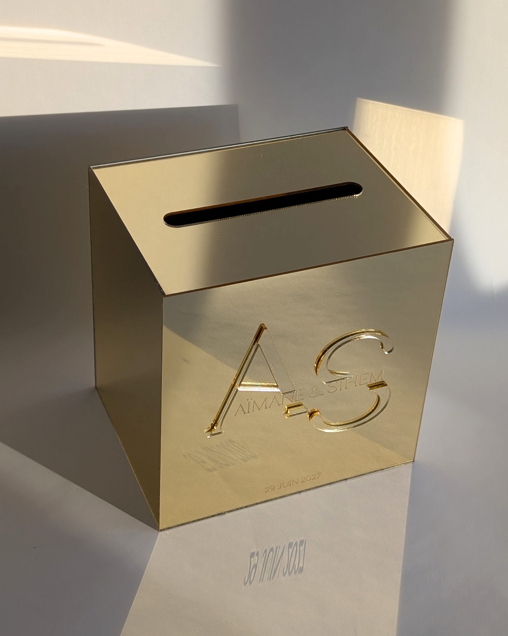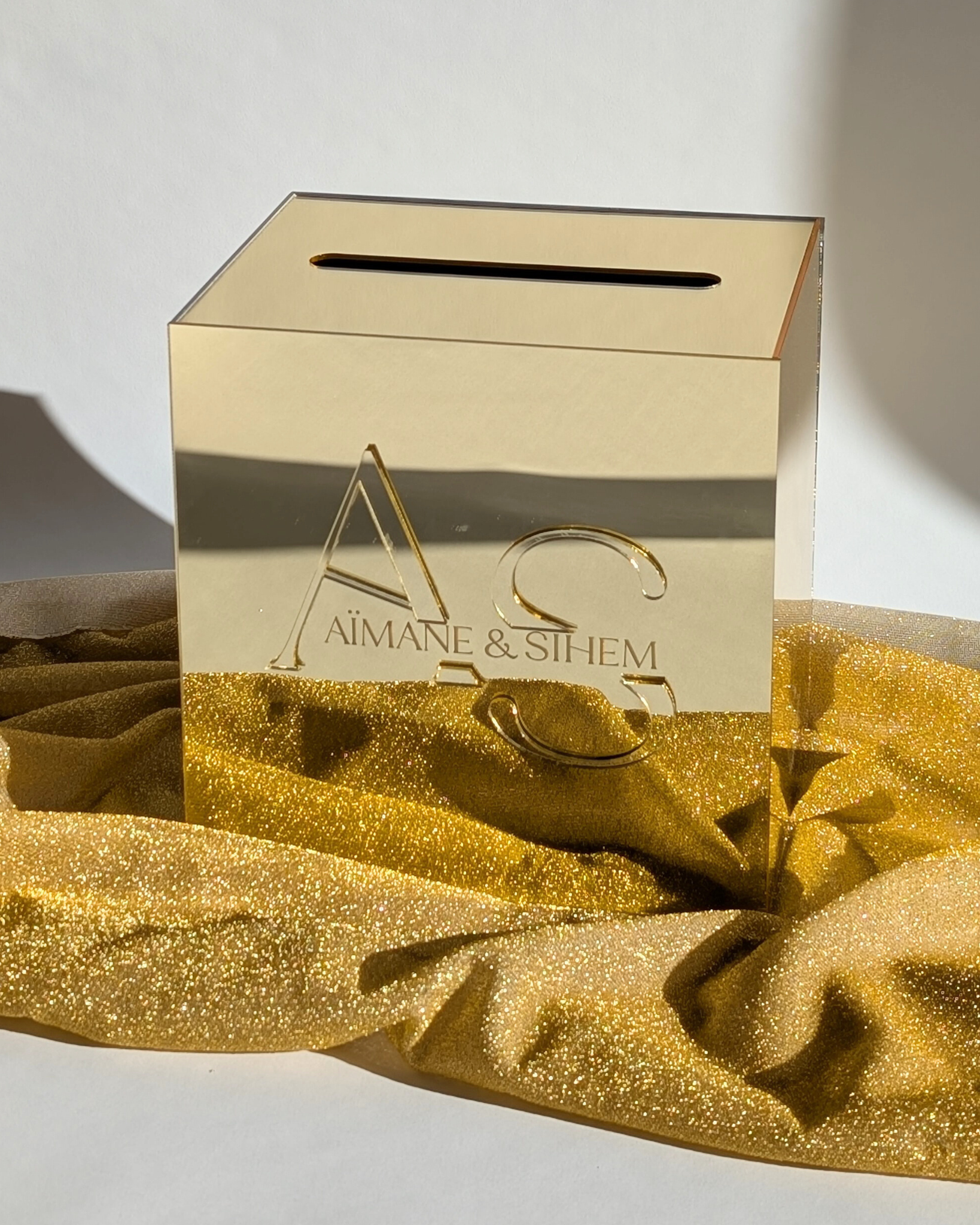 Urne en plexiglass personnalisée | Urne personnalisée theme mariage or